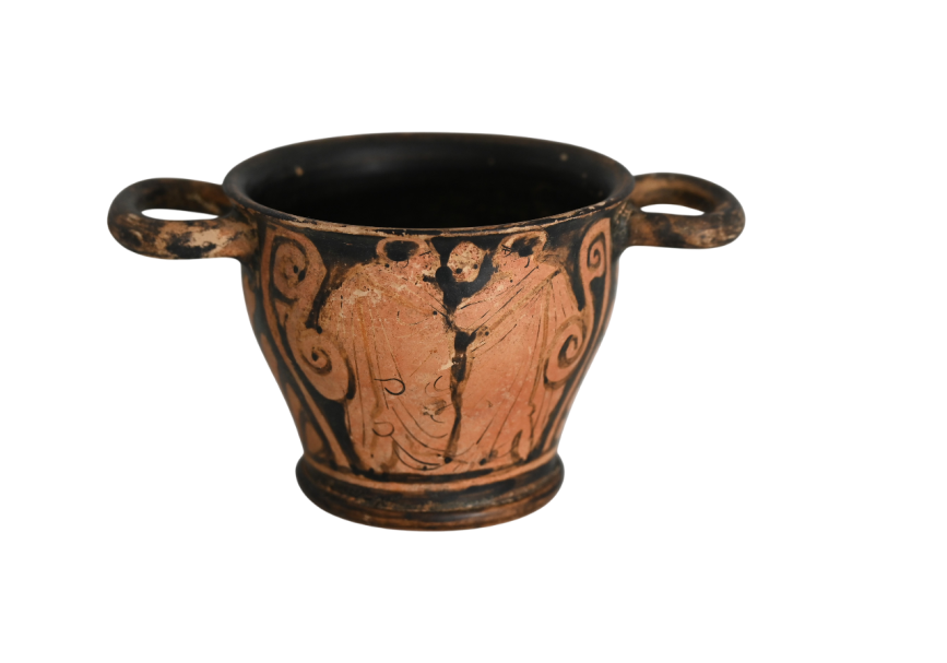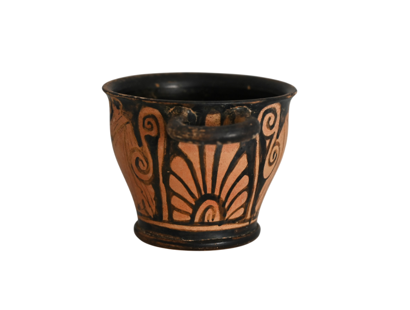 Red-figure pottery is essentially the successor to black-figure pottery and represents a major leap in Greek ceramic art. In red-figure pottery, the background is painted black while the figures themselves remain the natural red color of the clay, so Red-figure pottery reverses the black-figure method. Potters then add details with brushstrokes rather than incising them, which allows for more naturalistic and flexible depictions of anatomy, clothing, and expressions. Red-figure had some advantages over black-figure painting: it was possibly to gain greater detail and more complex and expressive poses.