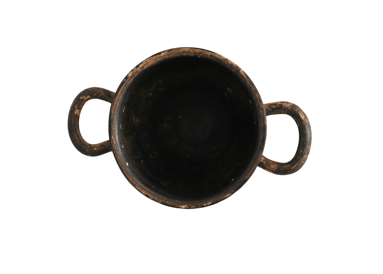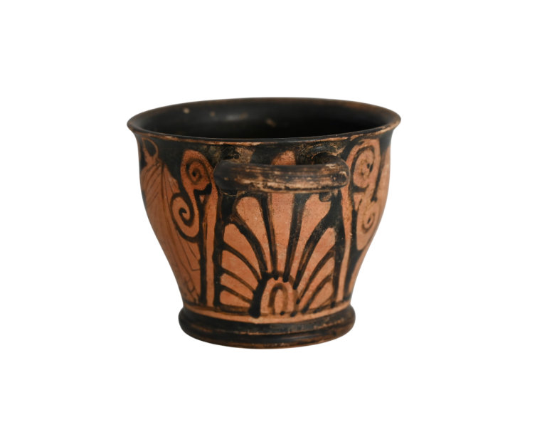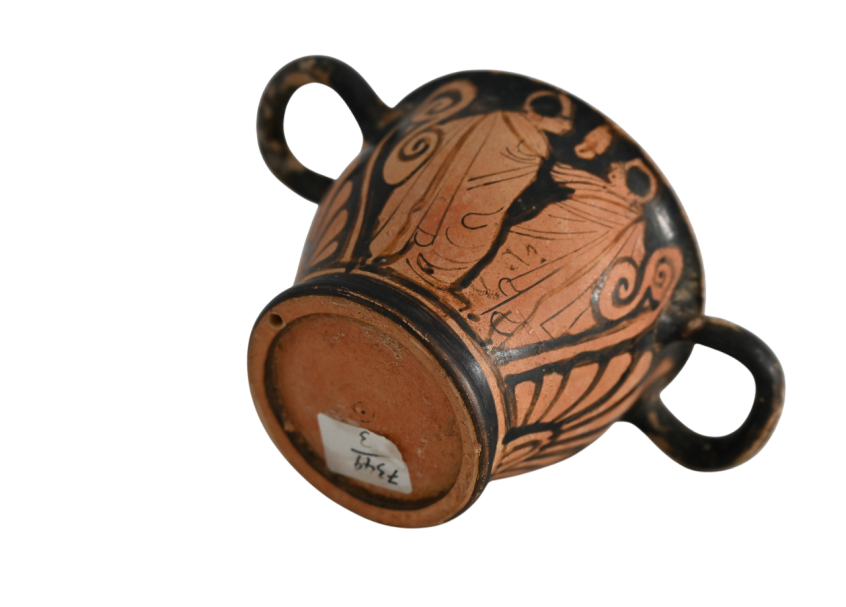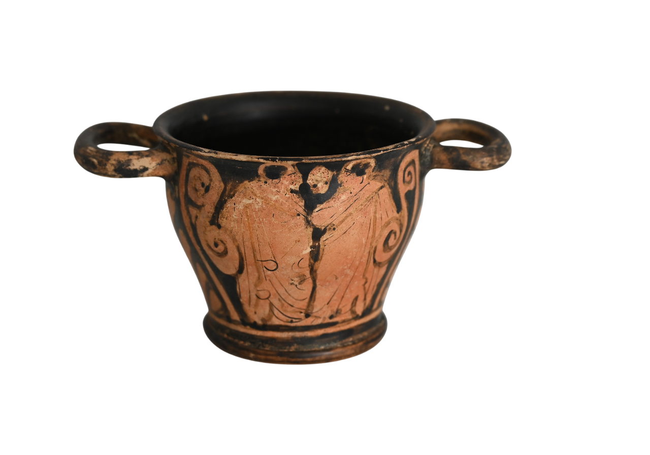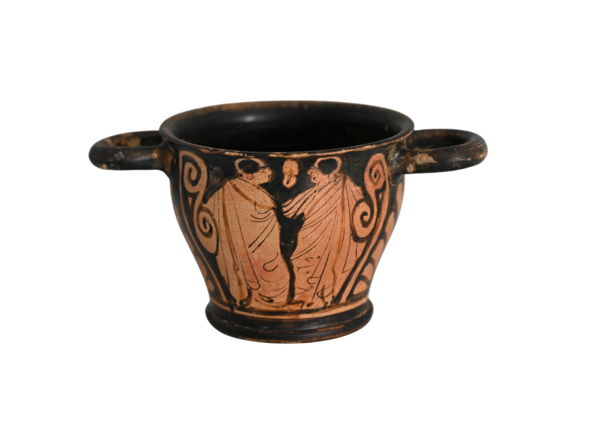 Attic red figure skyphos with youths wearing a himation on side A and side B. Under the handles palmettes on either side. Old label under the base of the skyphos.