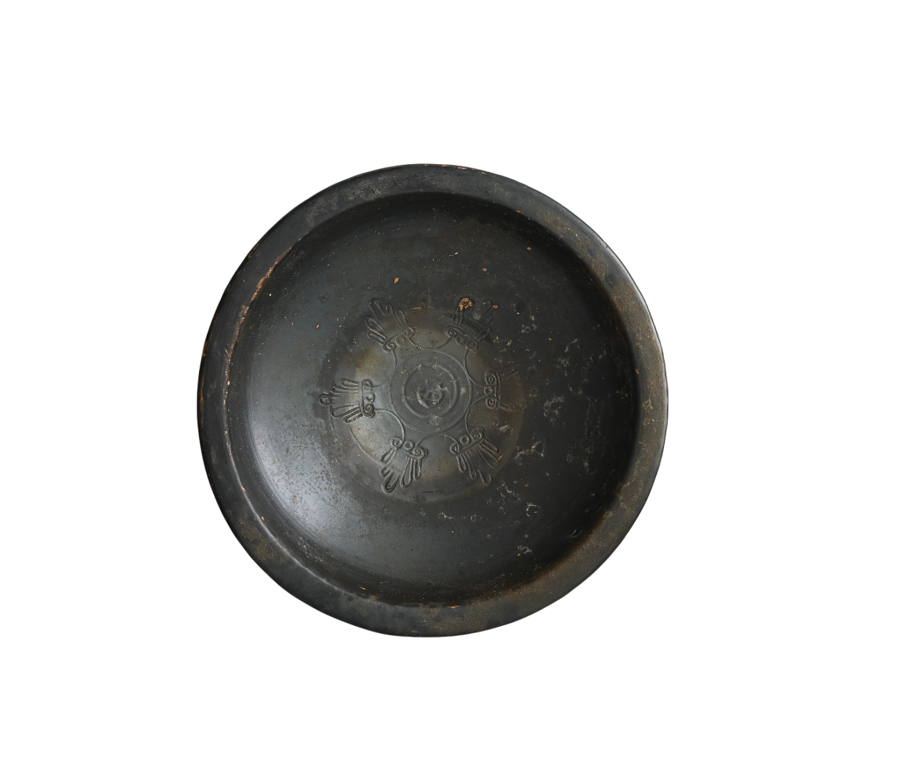 Campanian black glazed bowl with six stamped palmettes and in the center the remains of a face, most likely Dionysus or, a satyr or even a theatrical mask.