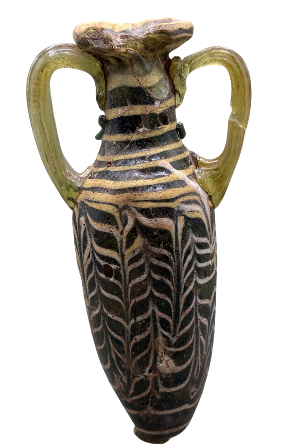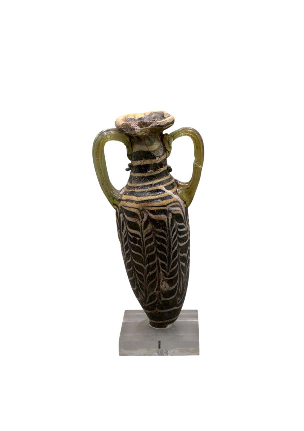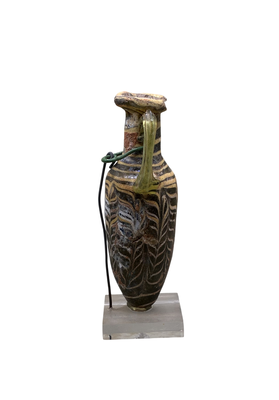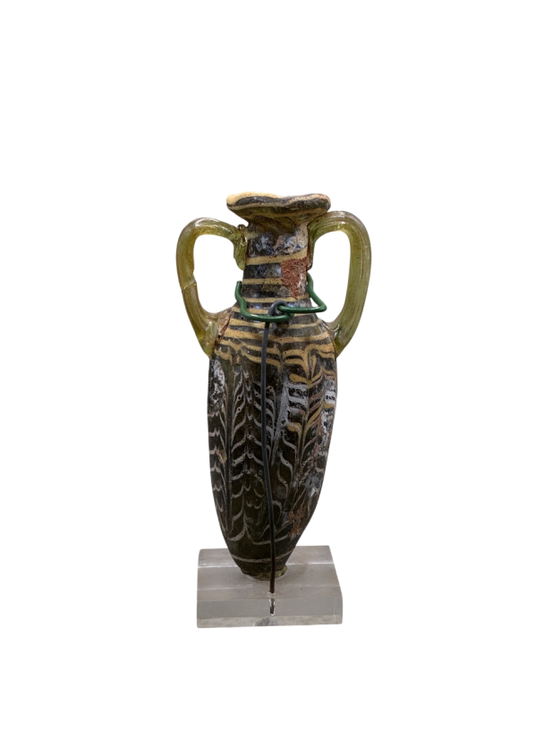 A Greek core-formed amphoriskos with twin green handles. Translucent green body (appears black) with yellow trail applied to edge of rim-disk and wound spirally down neck and across shoulder. White as secondary color applied over yellow at top of body, both tooled into a feather pattern on body in ten irregular panels of alternating upward and downward strokes, then fine white trail continuing on lower body in a spiral almost two turns but thicker yellow trail continuing and ending on pointed bottom.