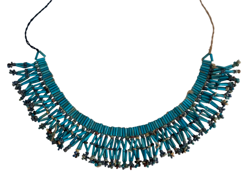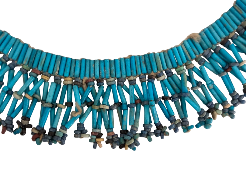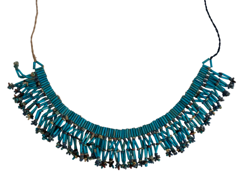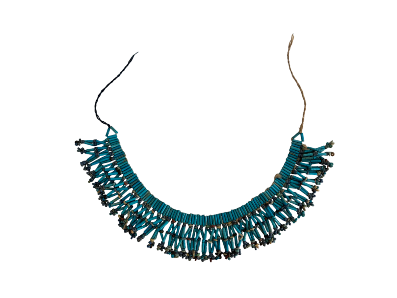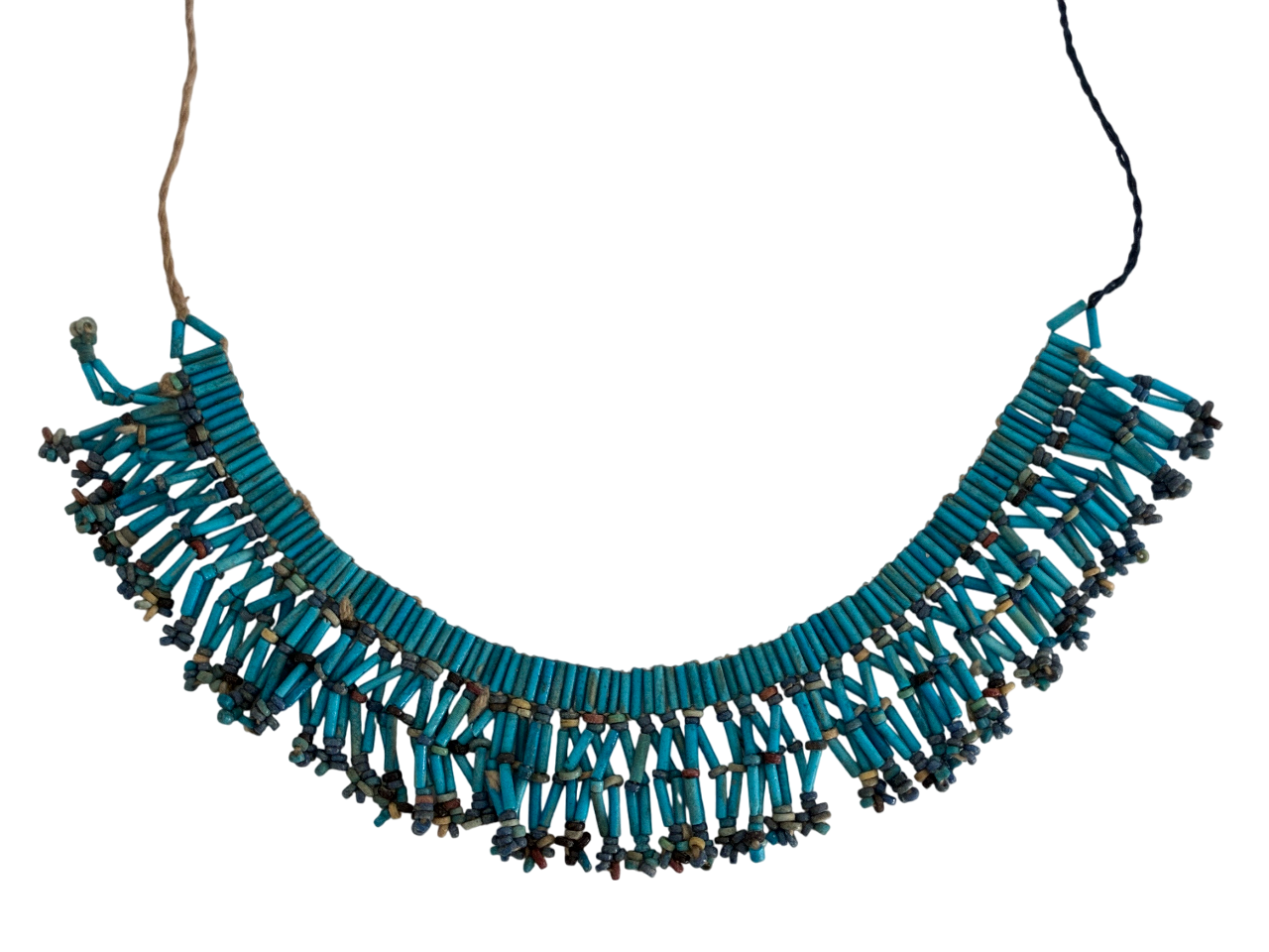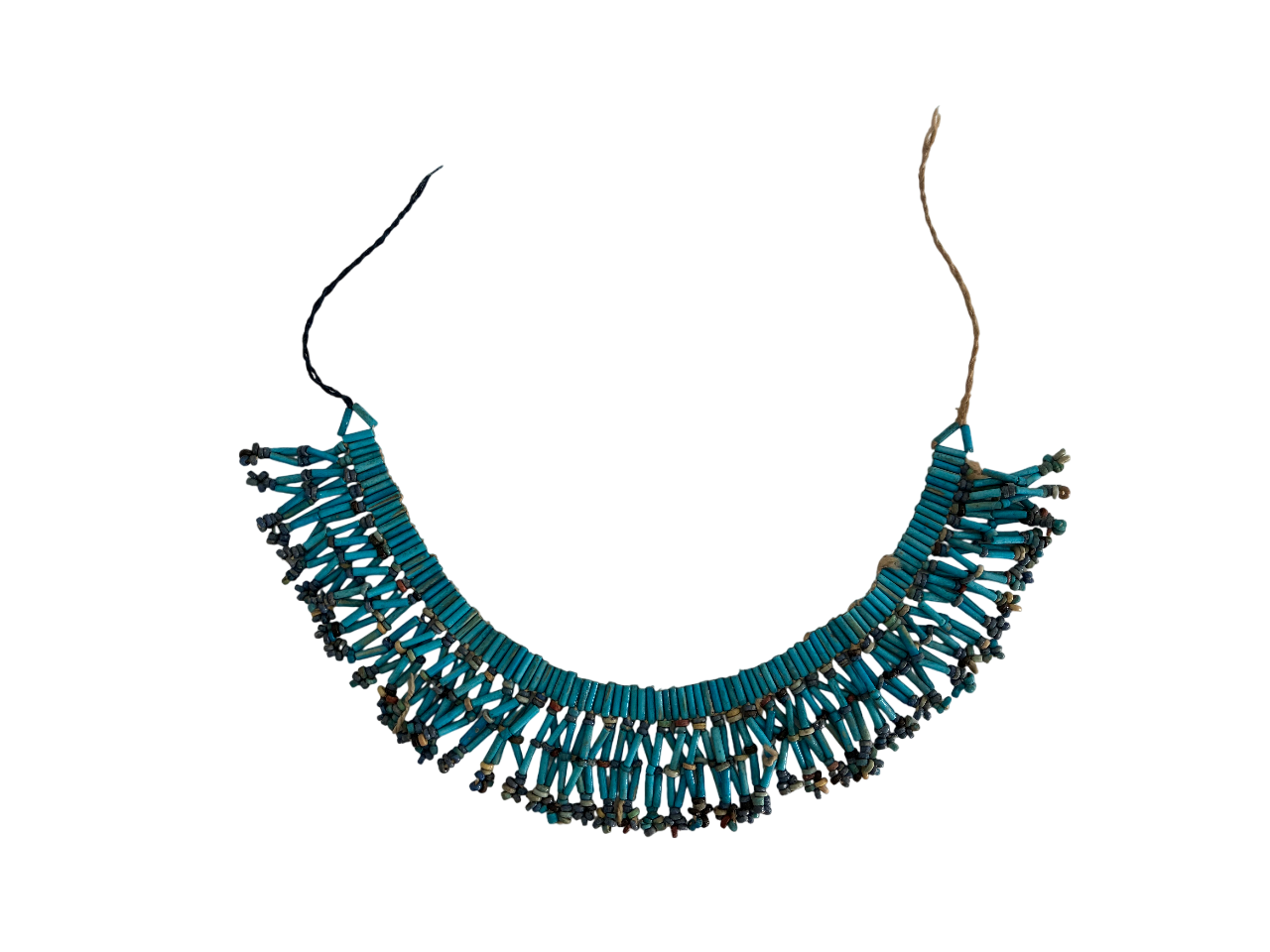 A blue faience bead broad collar, with both long cylindrical types and small circular beads. Some of the circular beads are from a different color: orange, green and black.