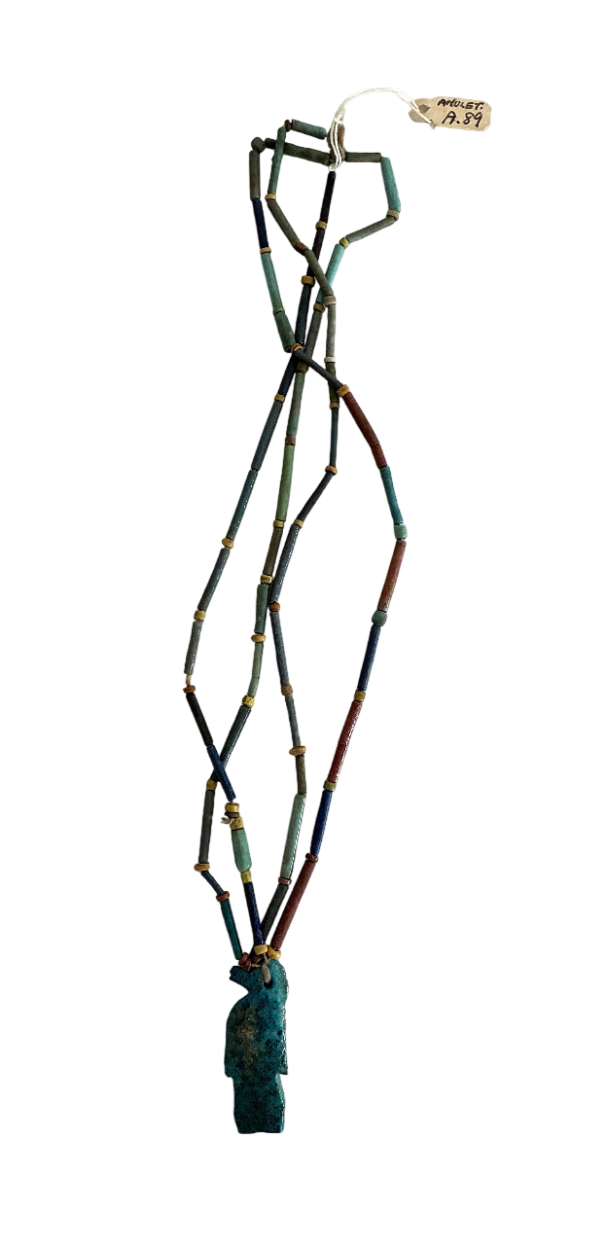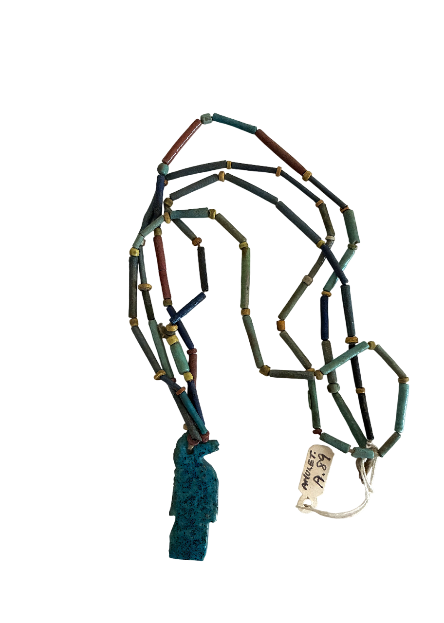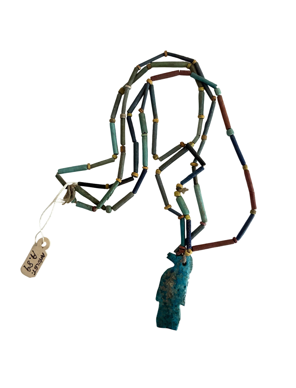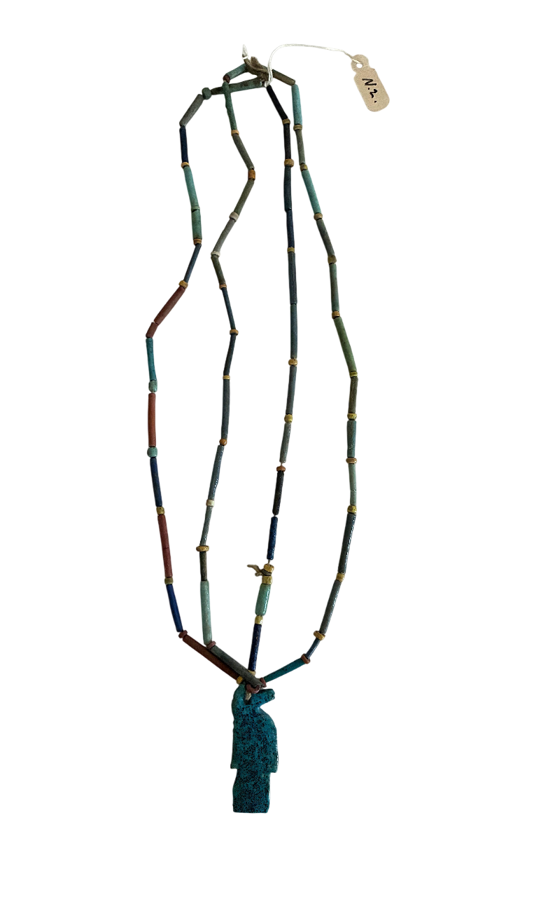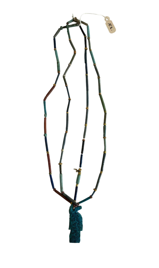 A colorful faience necklace with a blue faience Son of Horus plaque pendant, most likely representing Duamutef. Four different strings of faience beads alternate between long cylindrical types and small circular beads. The cylindrical beads differ greatly in color, ranging from light blue and grey to green, red and dark blue. The small circular beads are mostly yellow, with a handful of red.