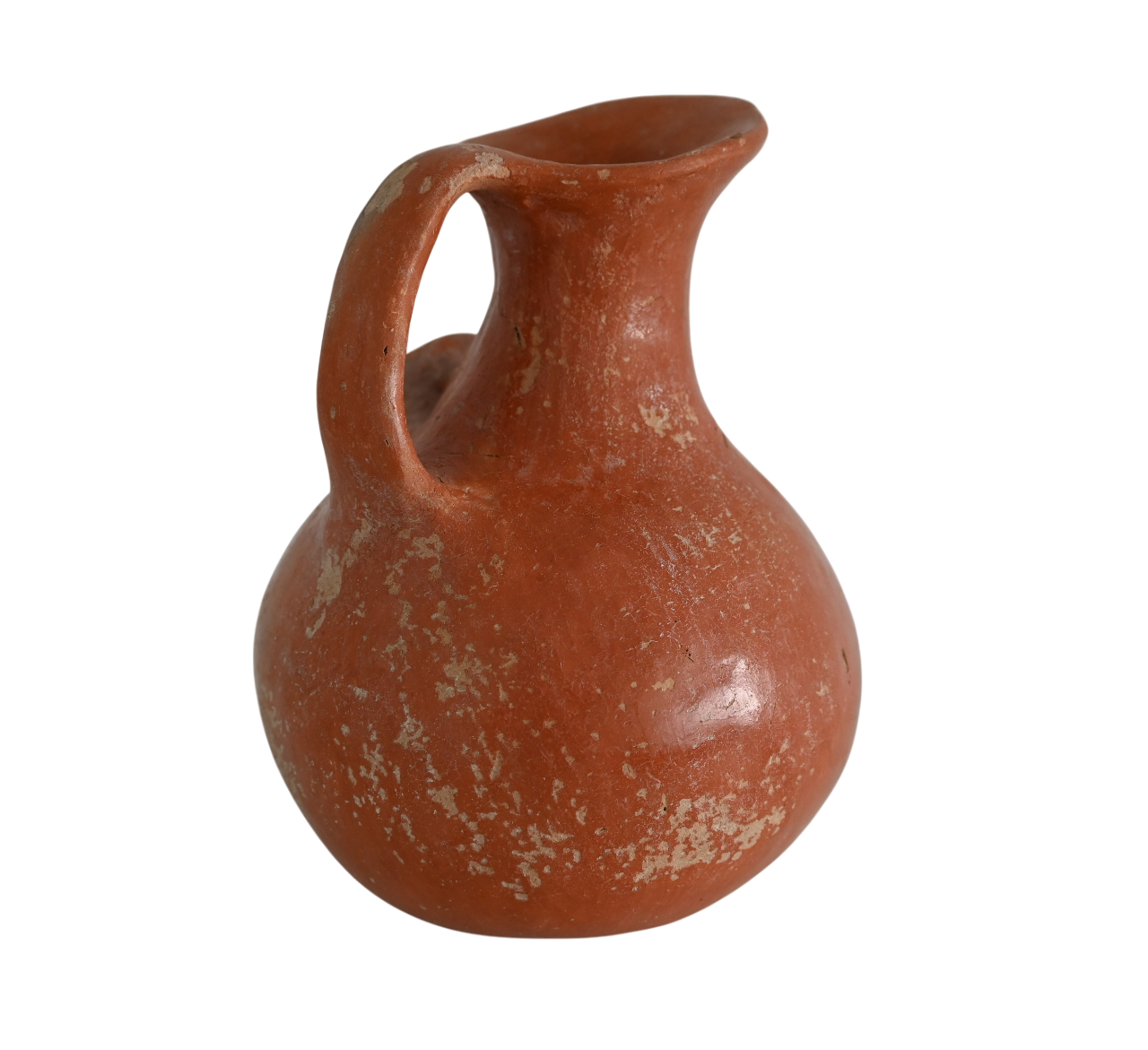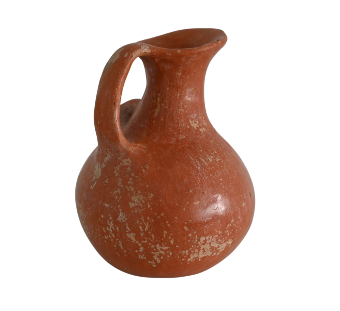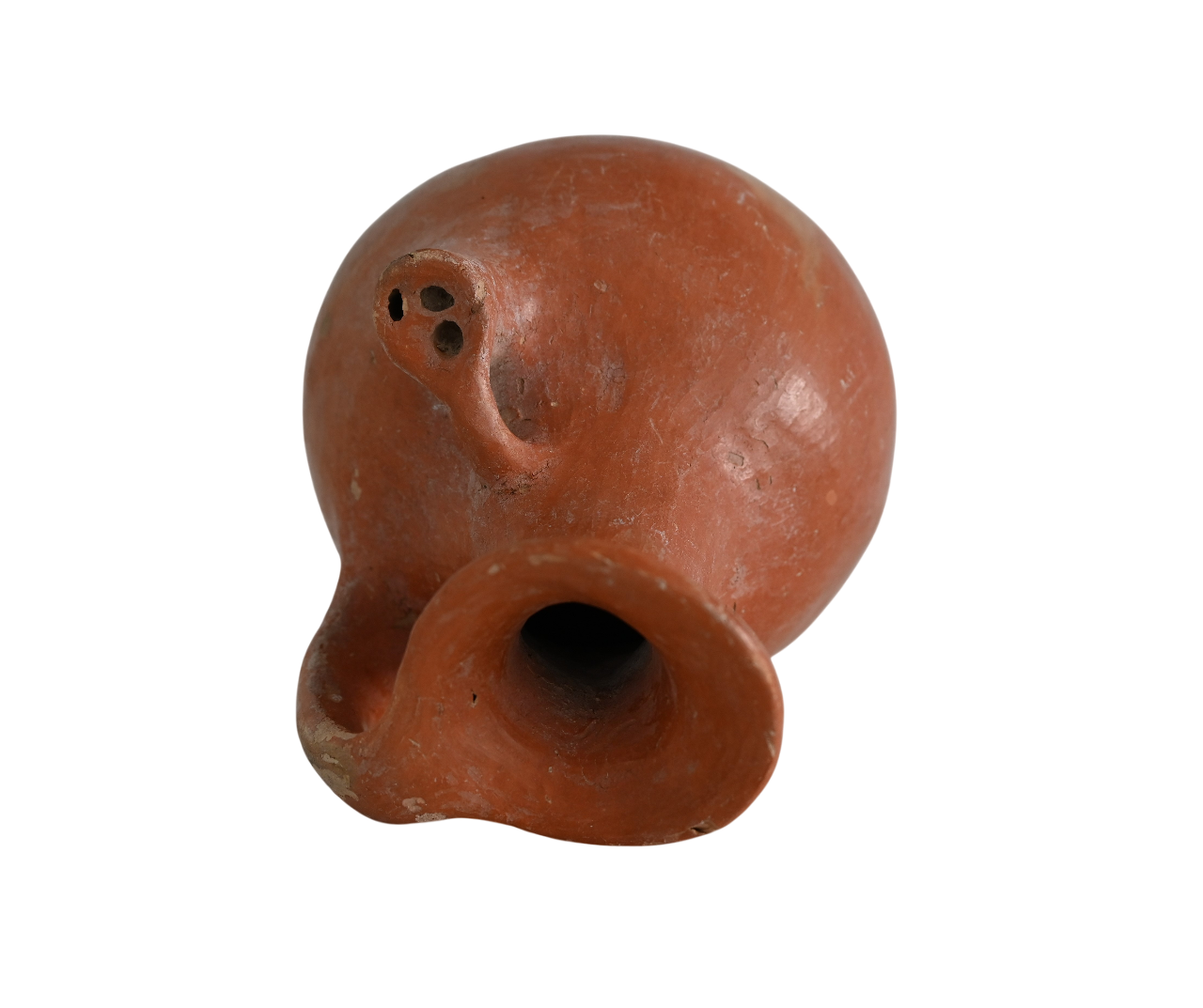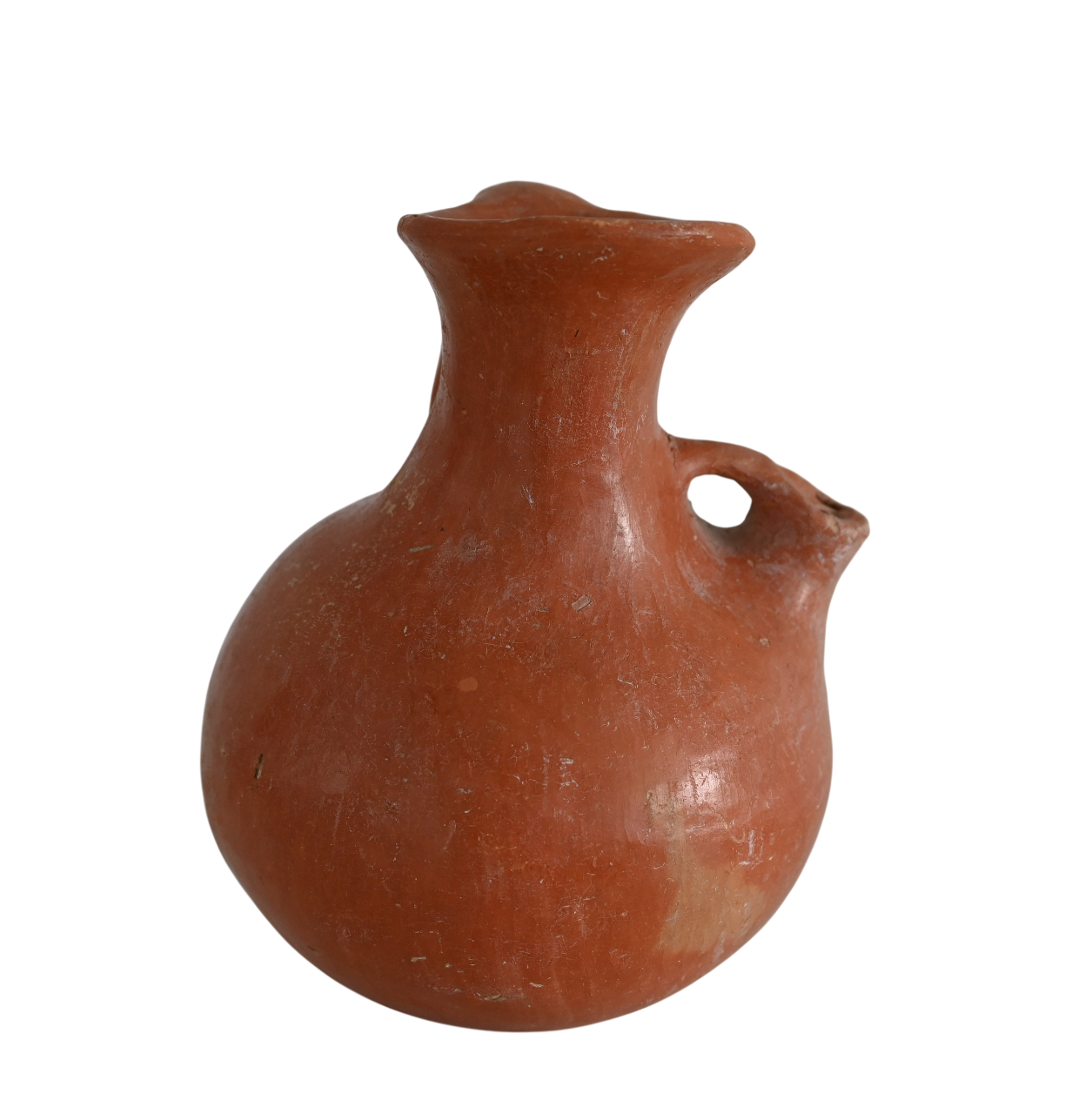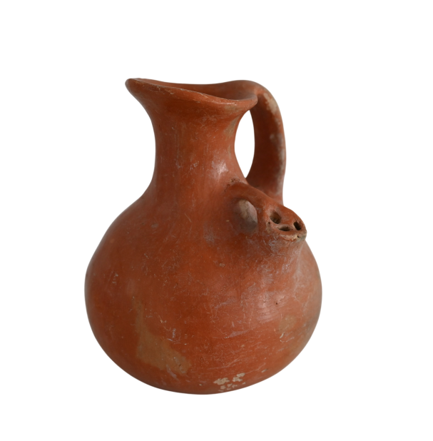 A Hittite red ware thick pottery vessel with spherical body, rounded lip, broader at the front, with a single side loop handle, a conical spout on one side of the body with three holes for restricting pouring, a loop extends from the spout to the body. It was used for storing liquids like water, oil, and wine. The red color comes from firing local clay in an oxidizing atmosphere.