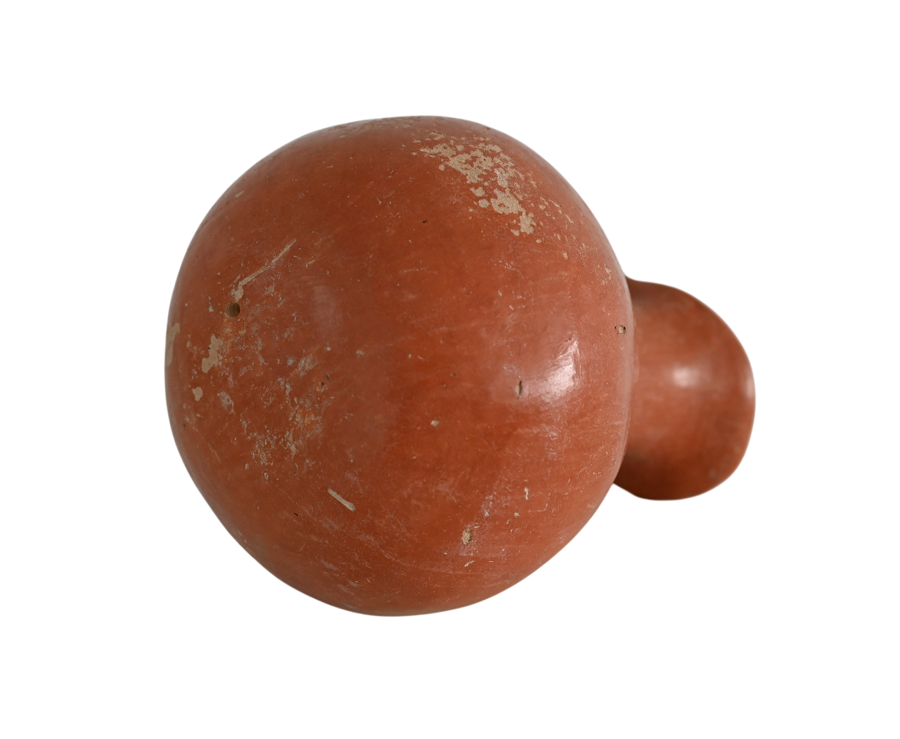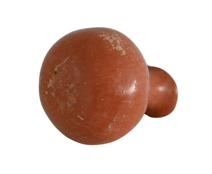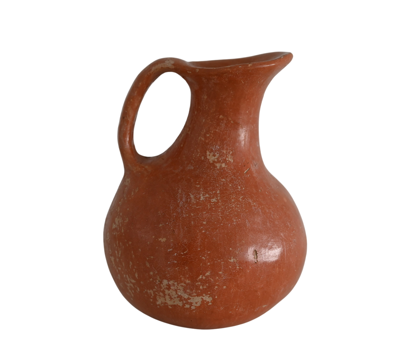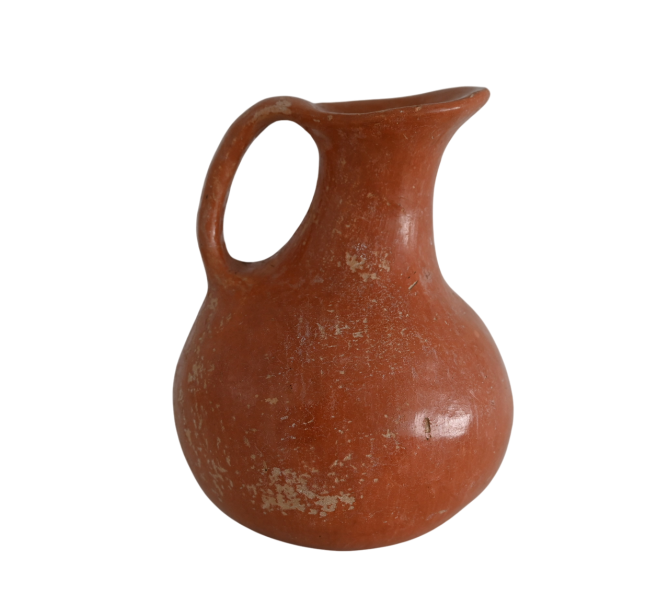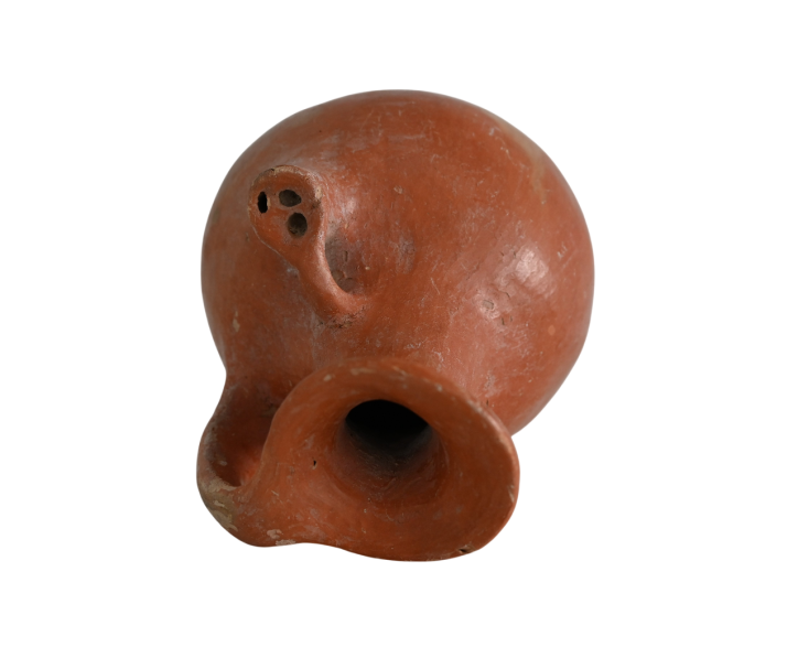 A Hittite red ware thick pottery vessel with spherical body, rounded lip, broader at the front, with a single side loop handle, a conical spout on one side of the body with three holes for restricting pouring, a loop extends from the spout to the body. It was used for storing liquids like water, oil, and wine. The red color comes from firing local clay in an oxidizing atmosphere.