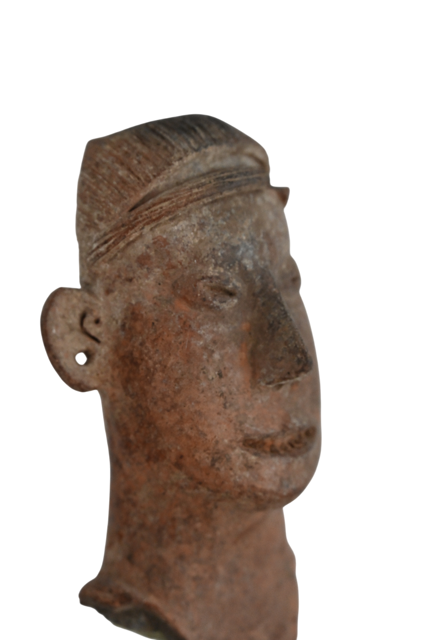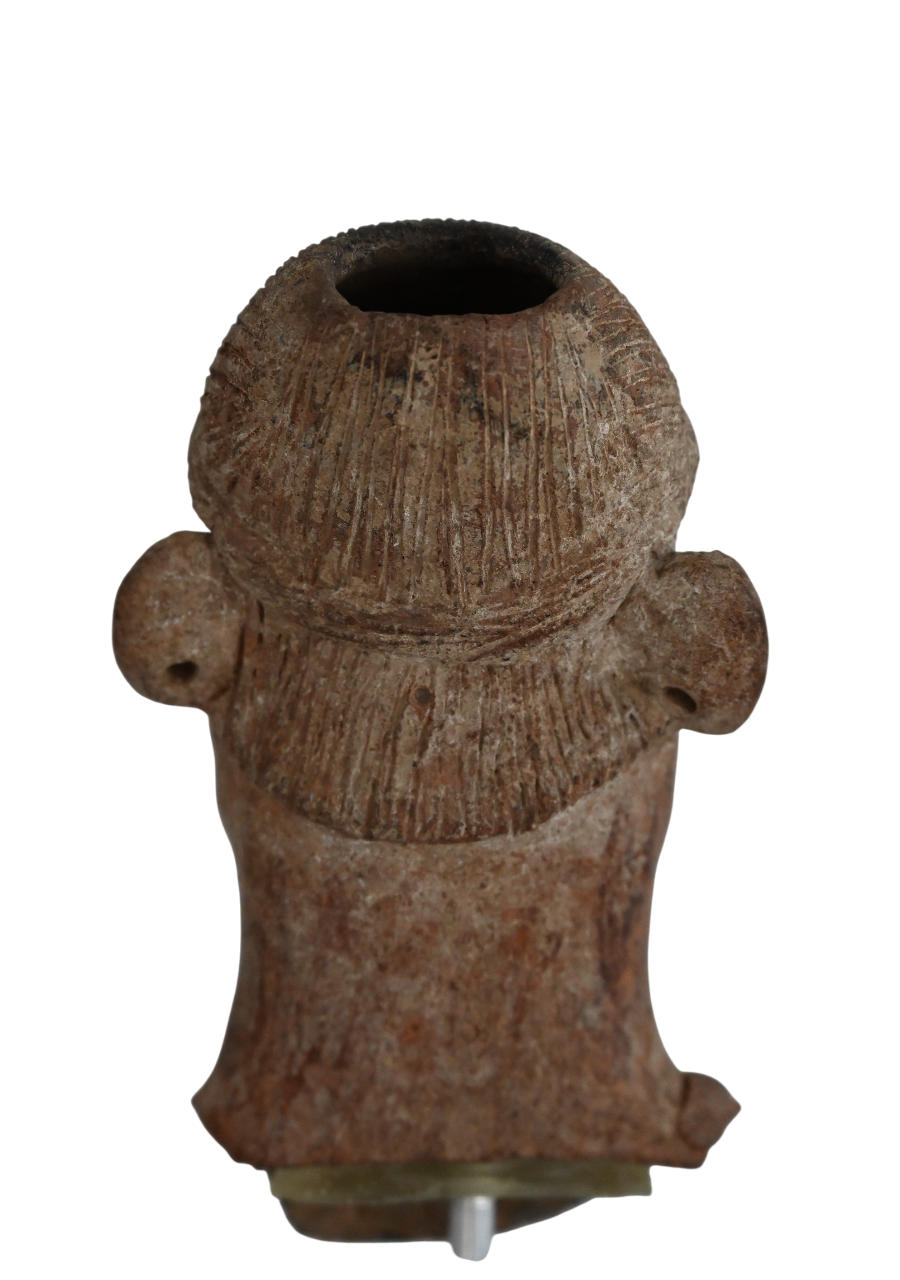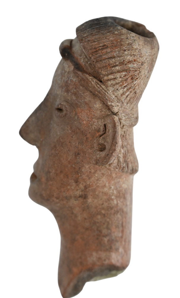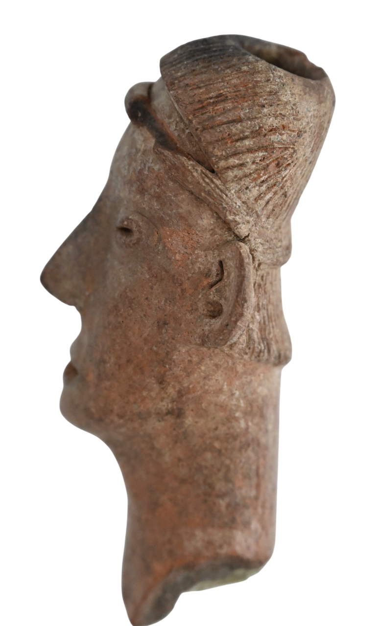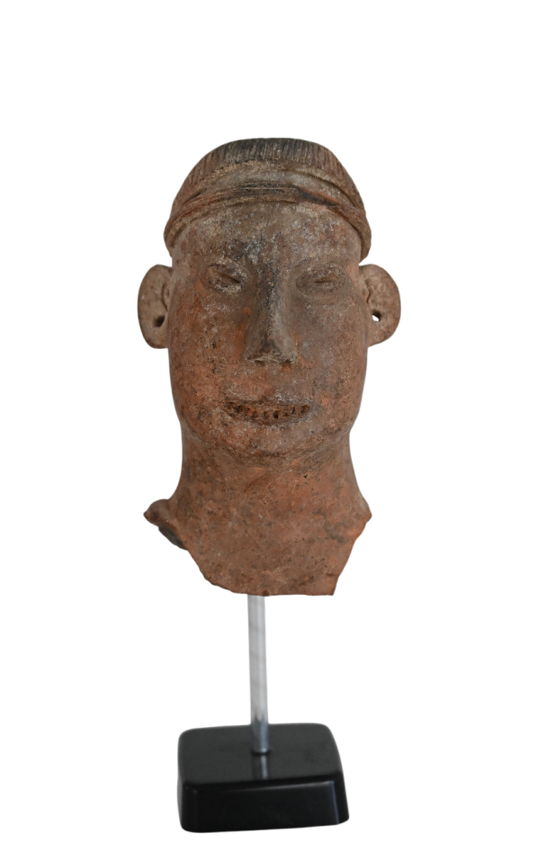 Head of a large figure with detailed head band. Hollow from the inside. Typical Jalisco facial features are finely carved: face is elongated with strong expressions (smiling), it has large almond-shaped (or coffee bean) eyes, a prominent nose, open mouth, piercings holes through both ears and a reddish surface.