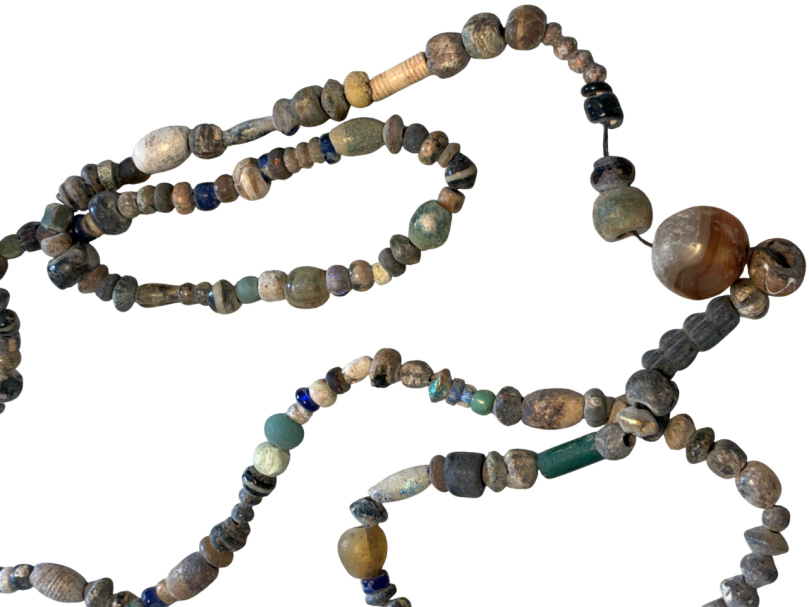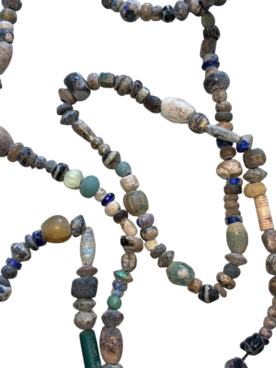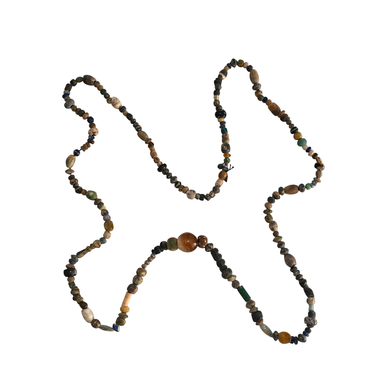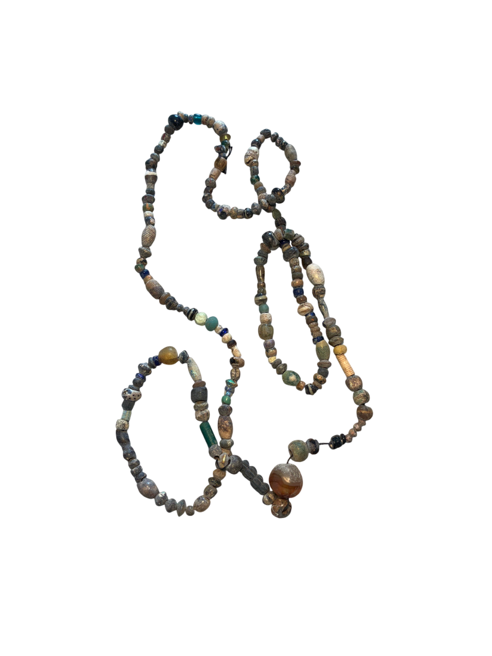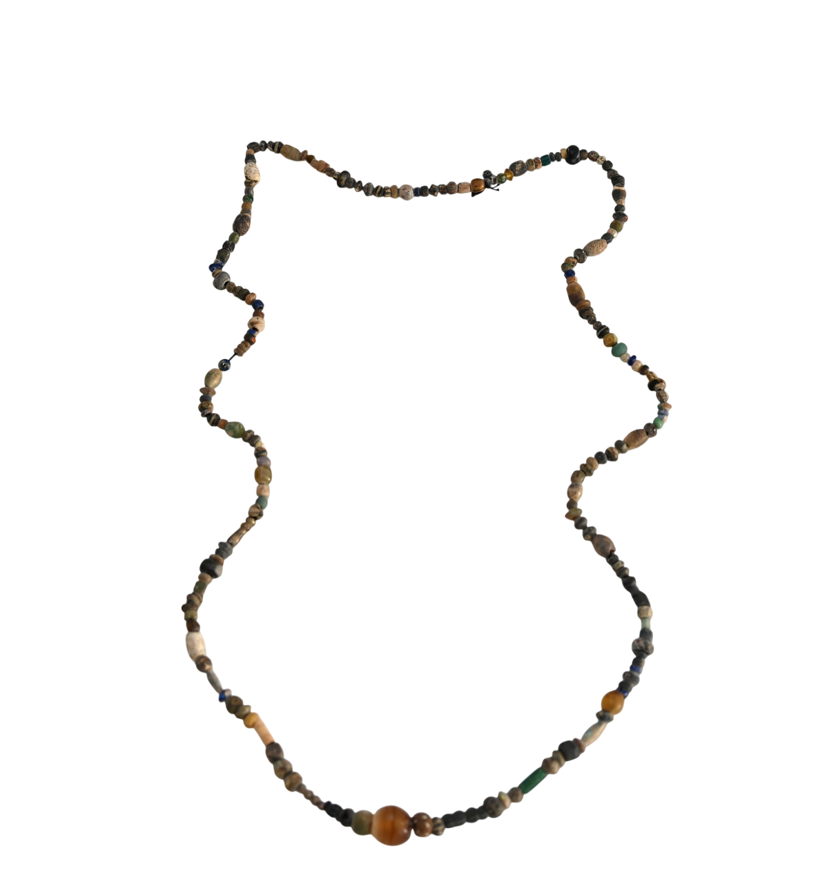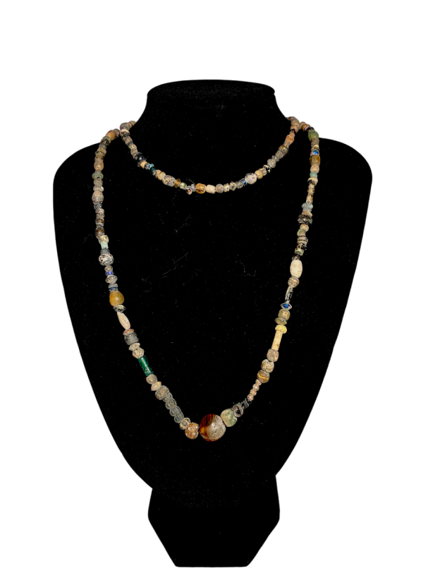 Roman glass bead necklace. The Roman glass beads interspersed with hard stone beads, the glass with some nice iridescence. Variety of different colors, some hard stone beads engraved.