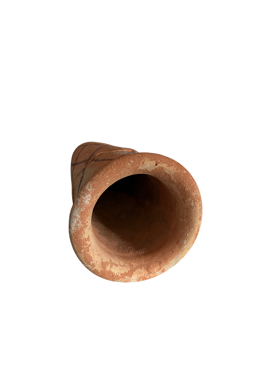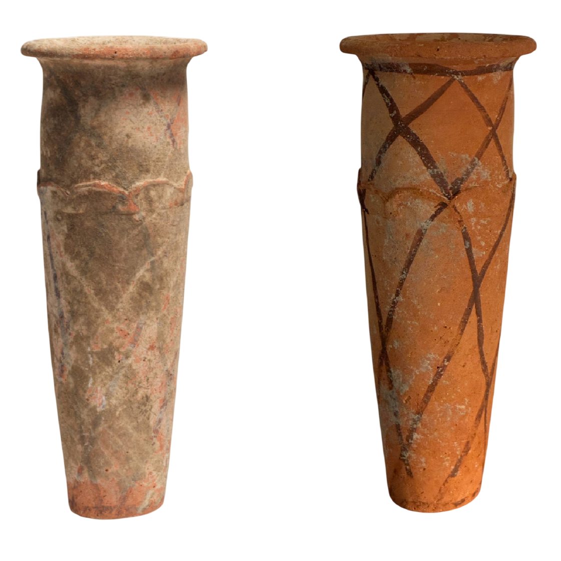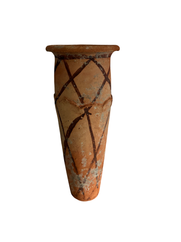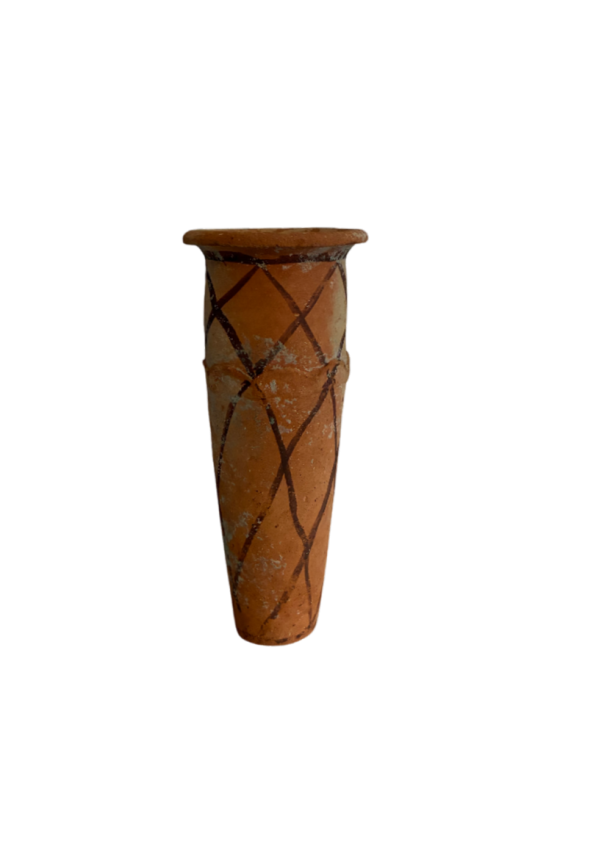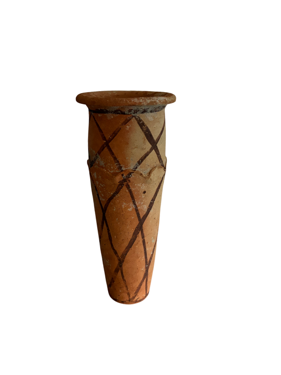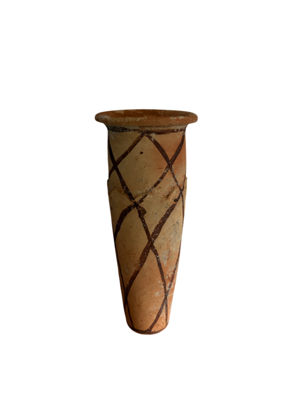 Flat based tall cylindrical pottery jar with wavy-handle design. Wavy pattern decorated painted in red. Wide rolled rim. Linear design on early Predynastic pottery such as this one were derived from baskets and reed matting. Last picture before (left) and after cleaning (right) with distilled water for weeks.