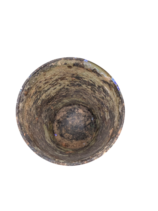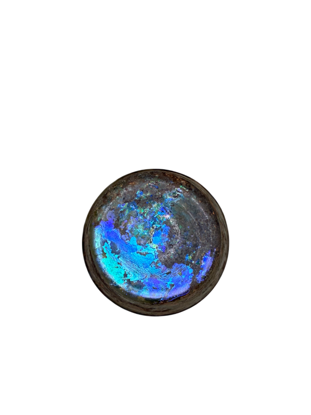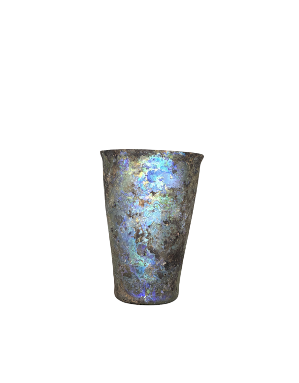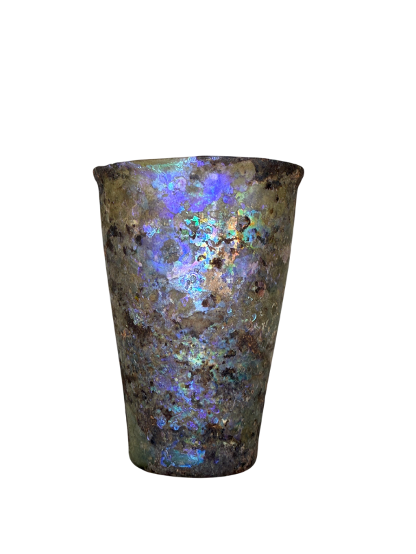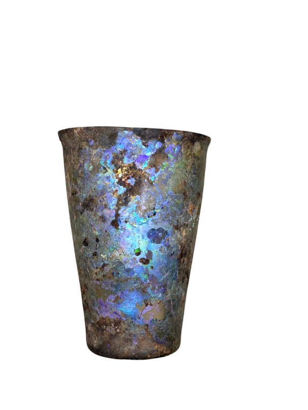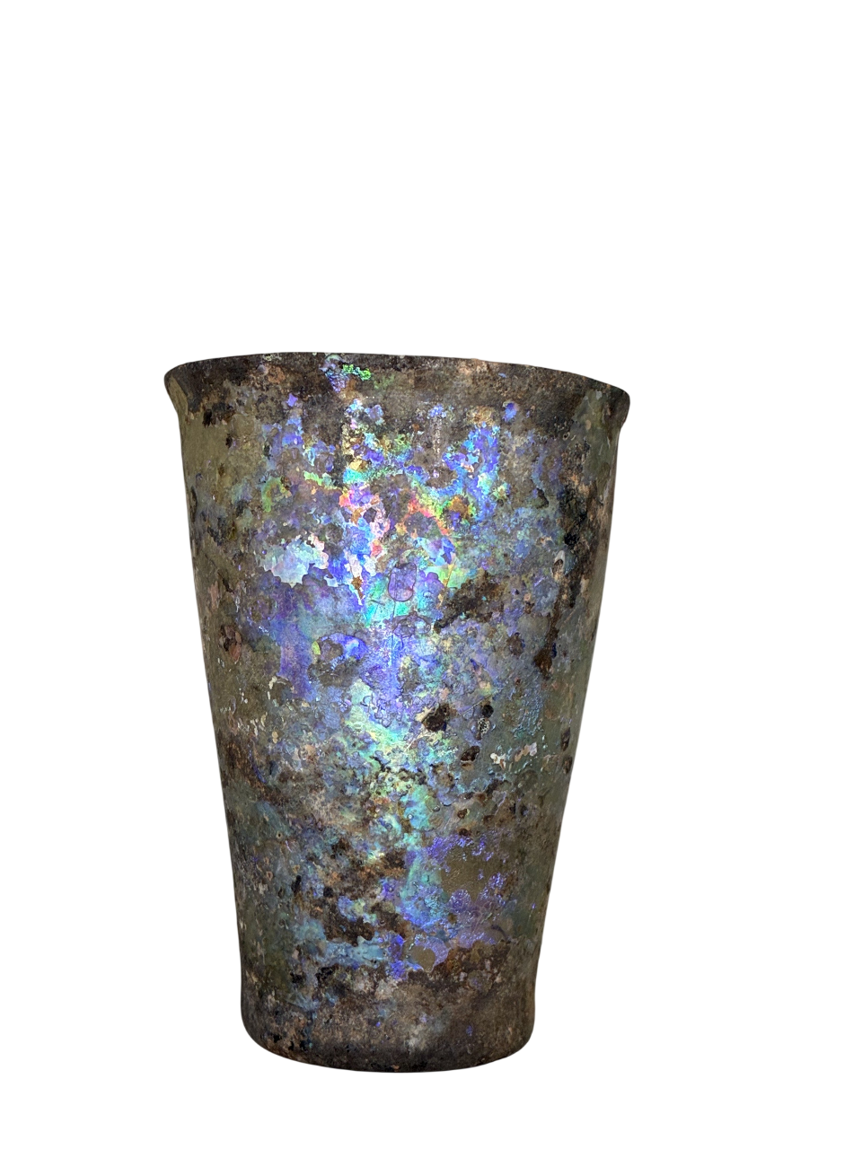 Beaker is intact and therefore in great condition. The glass is flaking/weathering from its sides and bottom. On the one hand this makes the amazing iridescence, but on the other hand it makes the sides fragile.