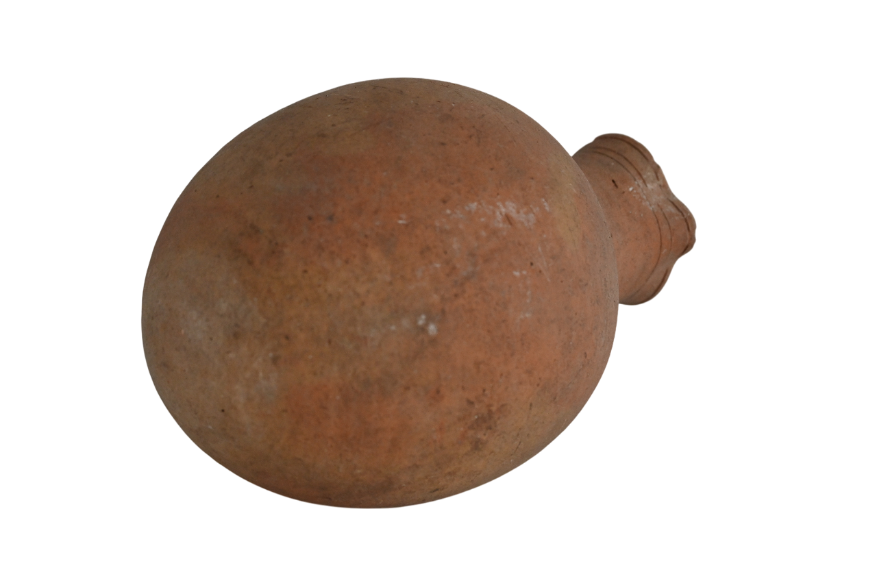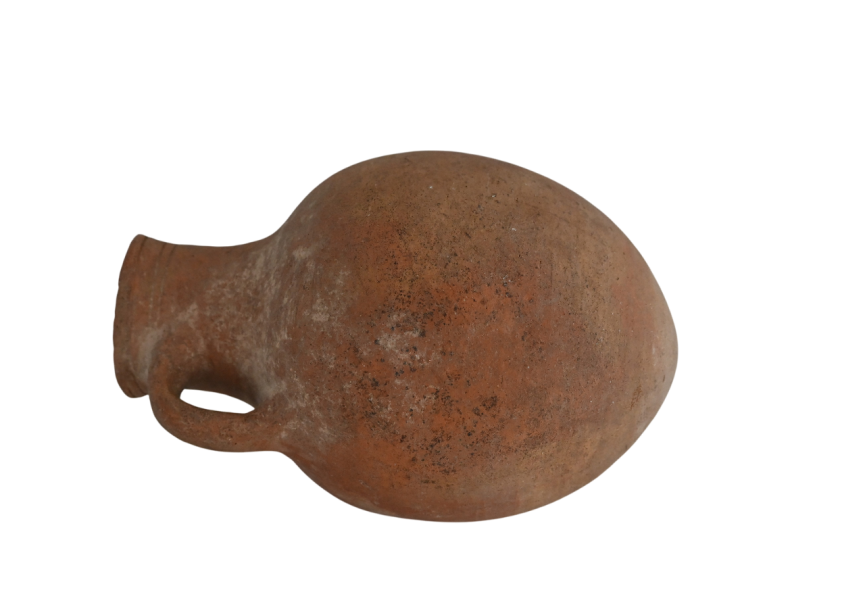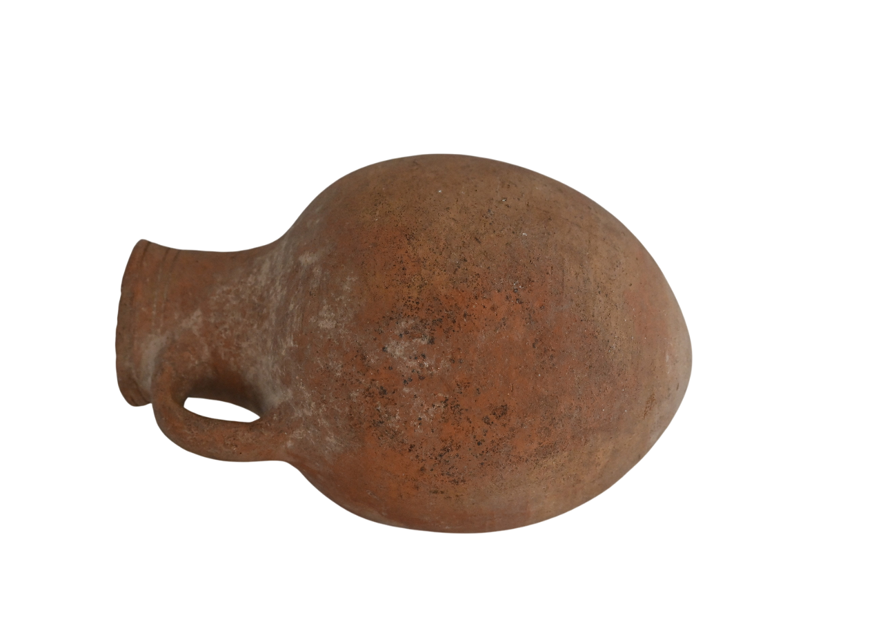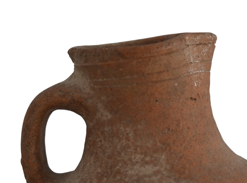 A late Roman terracotta oinochoe with rounded base and incised encircling lines below the rim.
