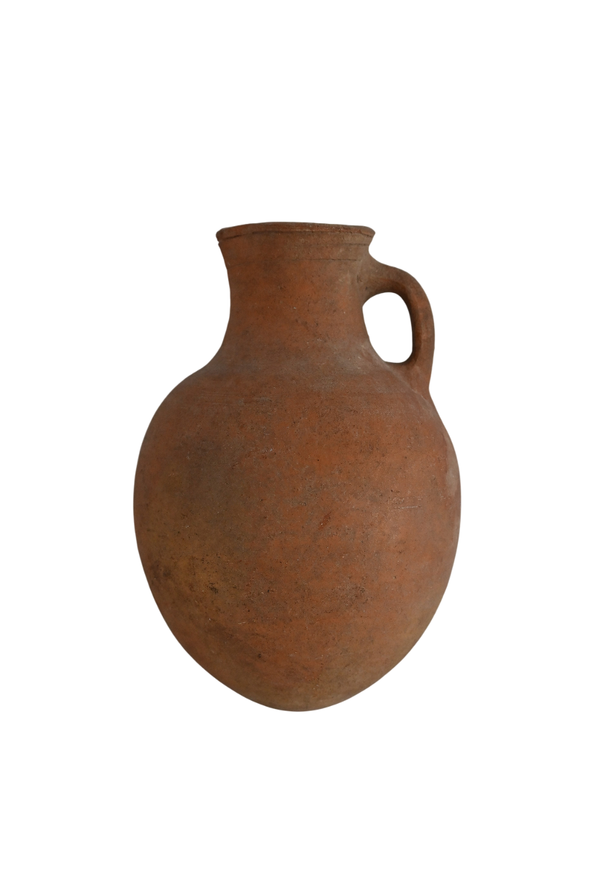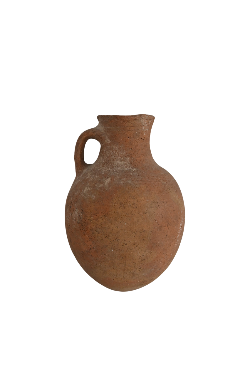 An oinochoe is a type of Greek and Roman wine jug used for pouring liquids, especially wine. The name comes from the Greek oinos (“wine”) and cheo (“to pour”). Typically they had a rounded or slightly globular body, a narrow neck, a single handle connecting the neck to the shoulder, and a spout for pouring. Many Late Roman oinochoe were plain or lightly painted, while some had geometric patterns and/or motifs.