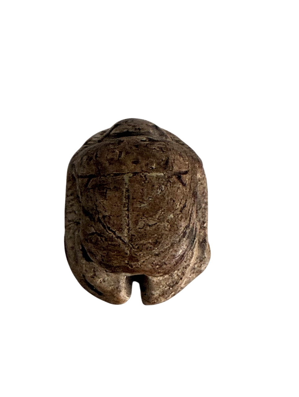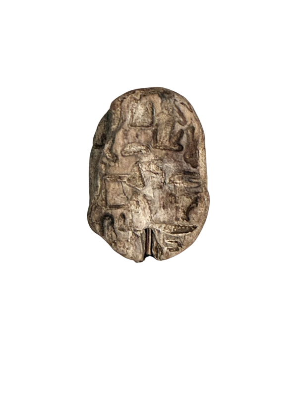 This scarab is inscribed with a blessing related to Ptah. The hieroglyphs are hard to read but thanks to comparable scarabs it reads:'Every good thing, [the god] Ptah repays for it in plenty.'