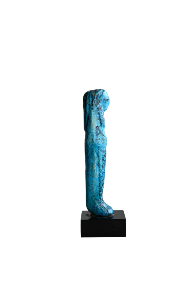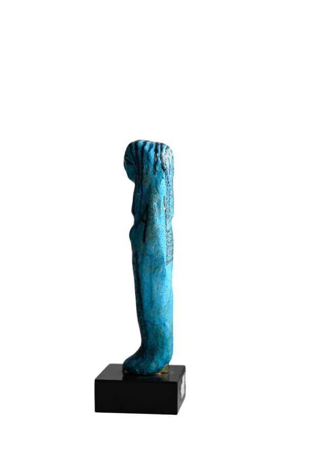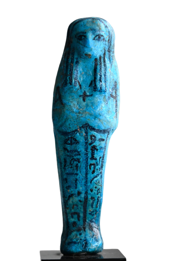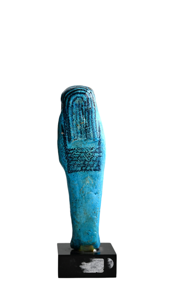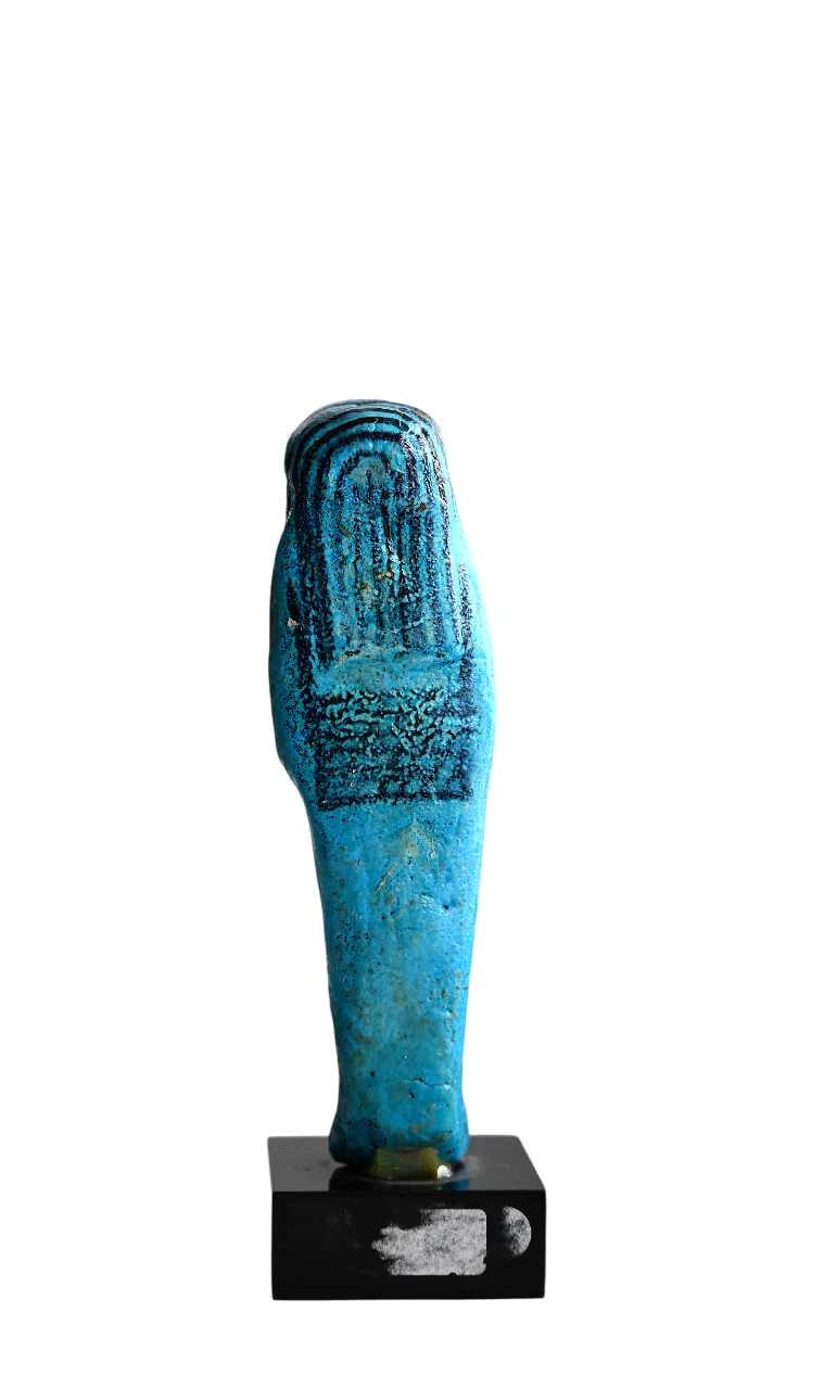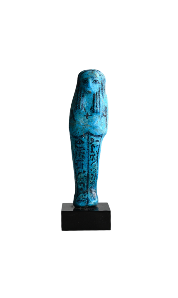Shabtis are ancient Egyptian funerary figurines meant to serve the deceased in the afterlife. Usually mummiform and made of faience, clay, wood, or stone, they often carry tools and bear hieroglyphs commanding them to do labor in the fields of Osiris, symbolizing the Egyptian vision of a continued, active life after death.