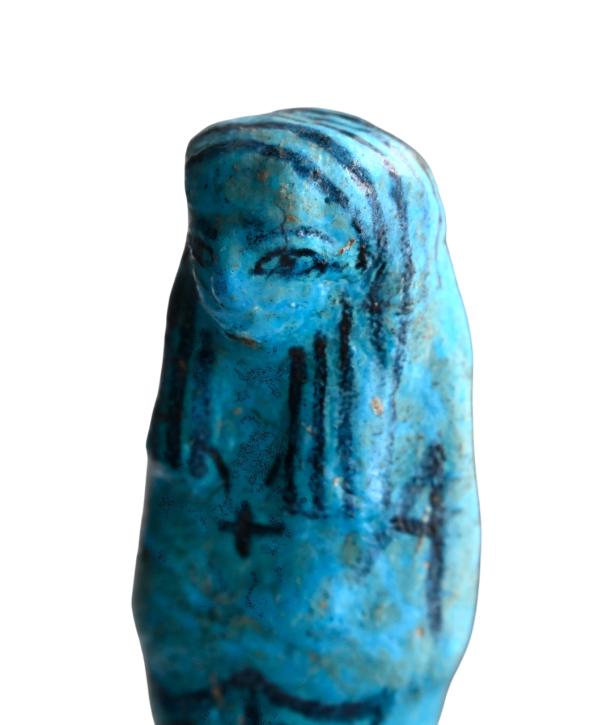 A beautiful blue faience worker shabti of Nesypernub with two vertical rows of hieroglyphs at the front. The shabti is mummiform with arms folded and holding two hoes. He wears a tripartite wig with black lines. On the back he carries a basket, suspended from two line at the shoulders. Unique is that he wears a amulet (ib) at the front.