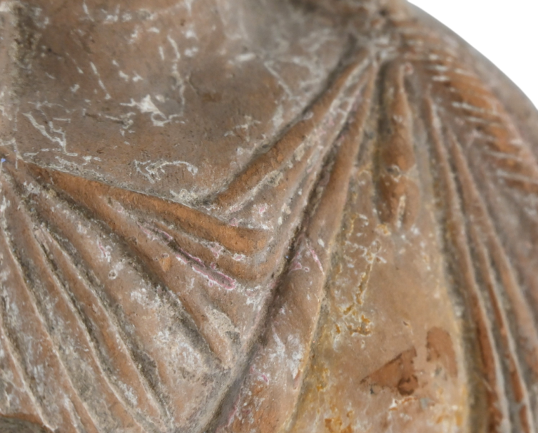 Small torso/bust of Artemis. Artemis, the Greek goddess of the hunt, is depicted wearing a finely detailed chiton with a nebris: a fawn skin. Over the left shoulder a fawn hoof is clearly visible. Remainder of yellow and pink slip visible.